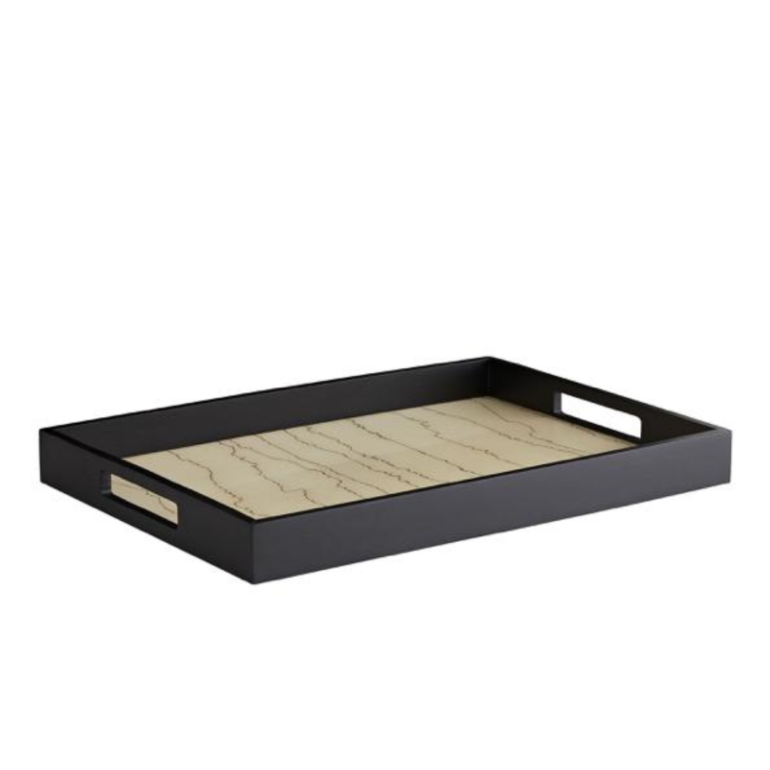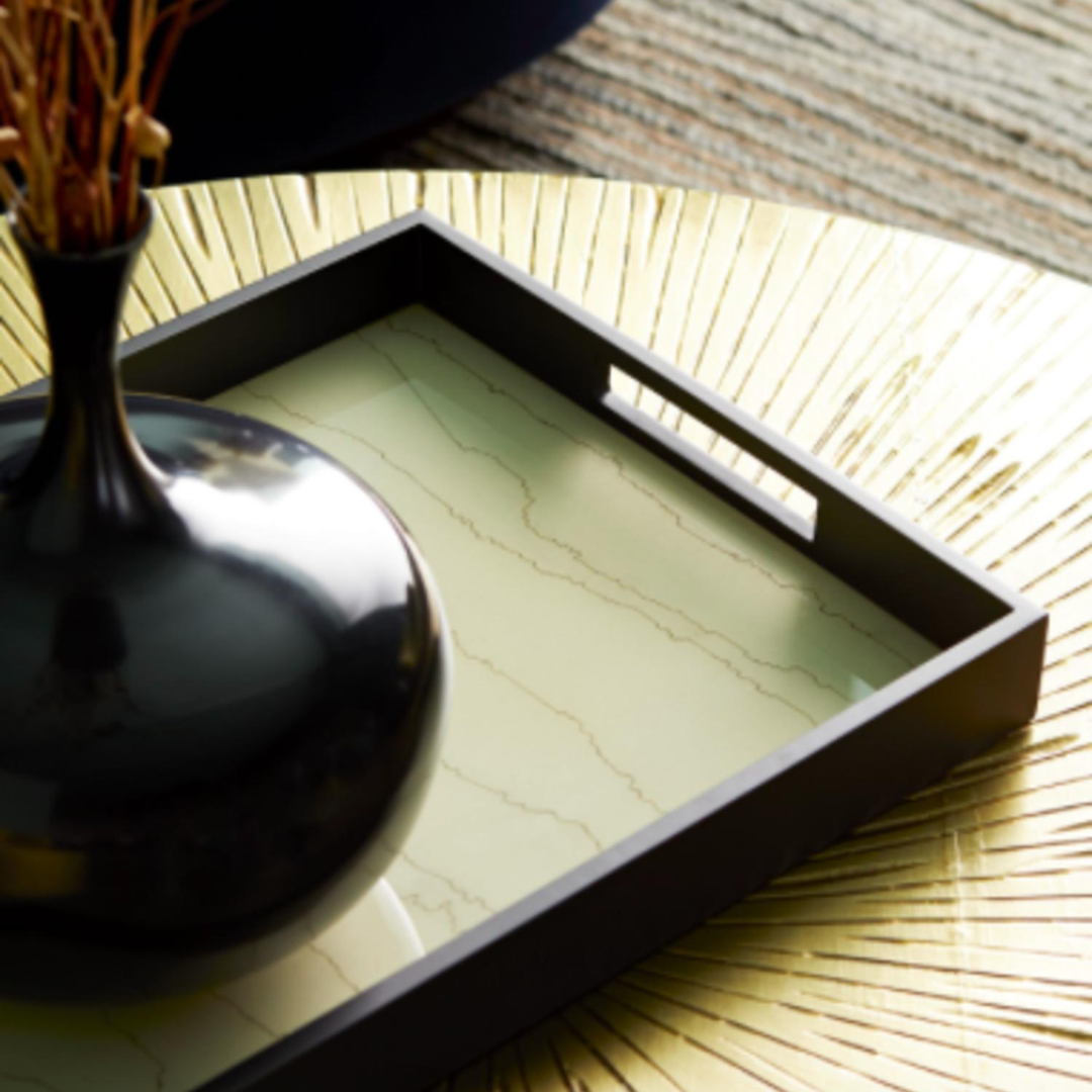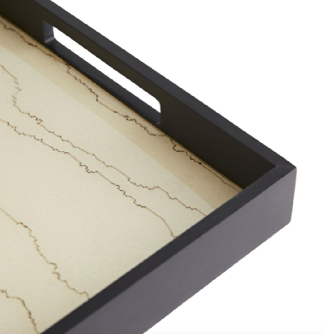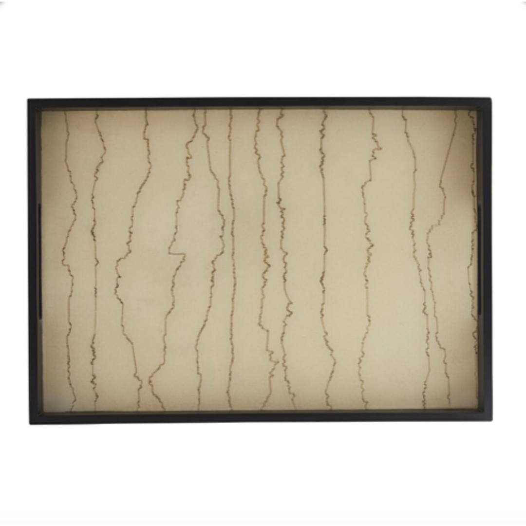 Serve guests at your next soirée with unprecedented style. Thin strips of cream-colored linen are laser-cut and then stratified to highlight the burned edges that undulate across the surface. Framed in wood with a black finish & thin layer of clear resin.