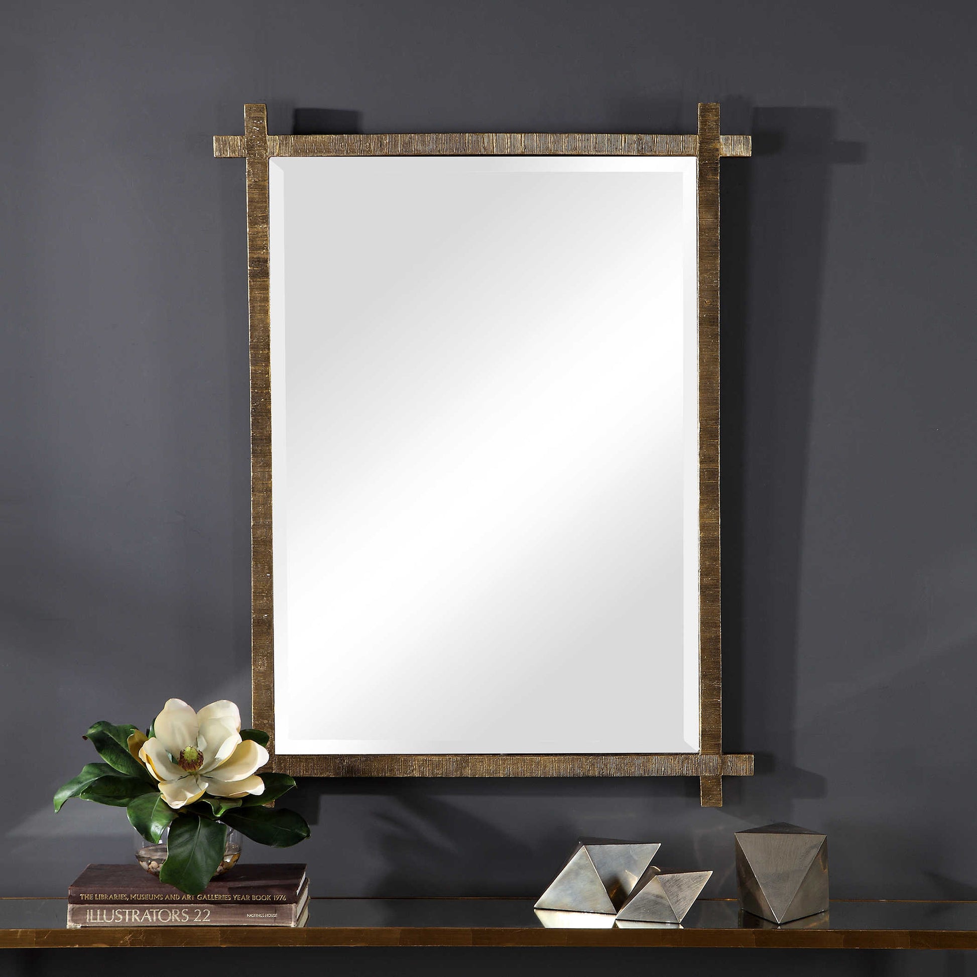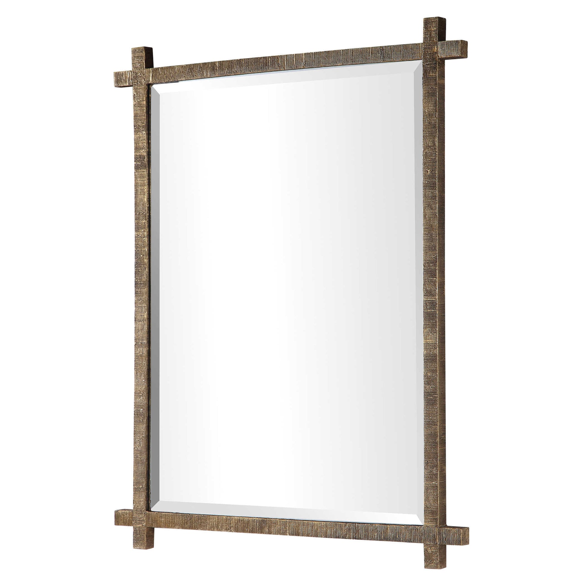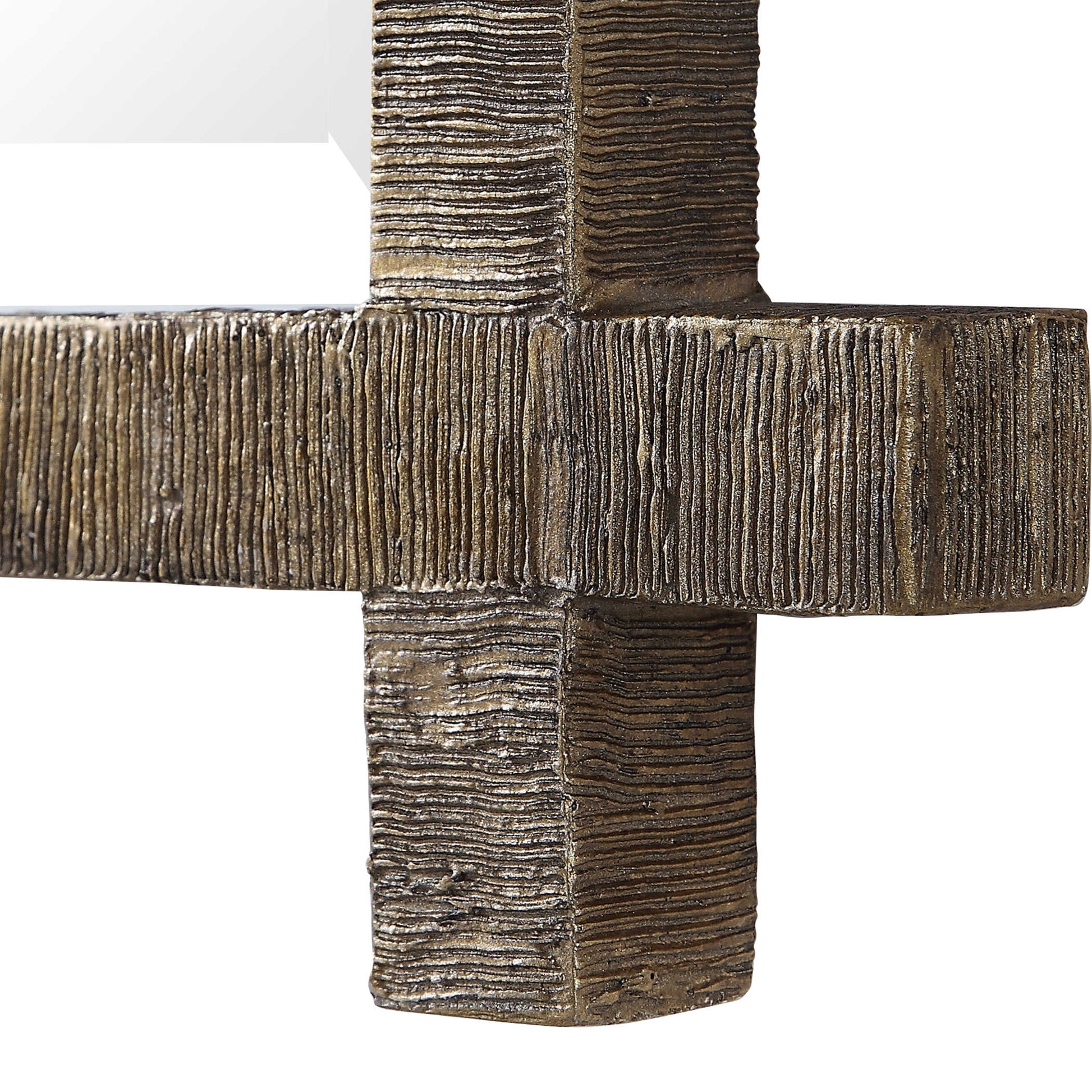 This mirror features an antique gold finished frame with ribbed texture, adding a tribal feel. The piece has a generous 1 1/4" bevel and may be hung horizontal or vertical.