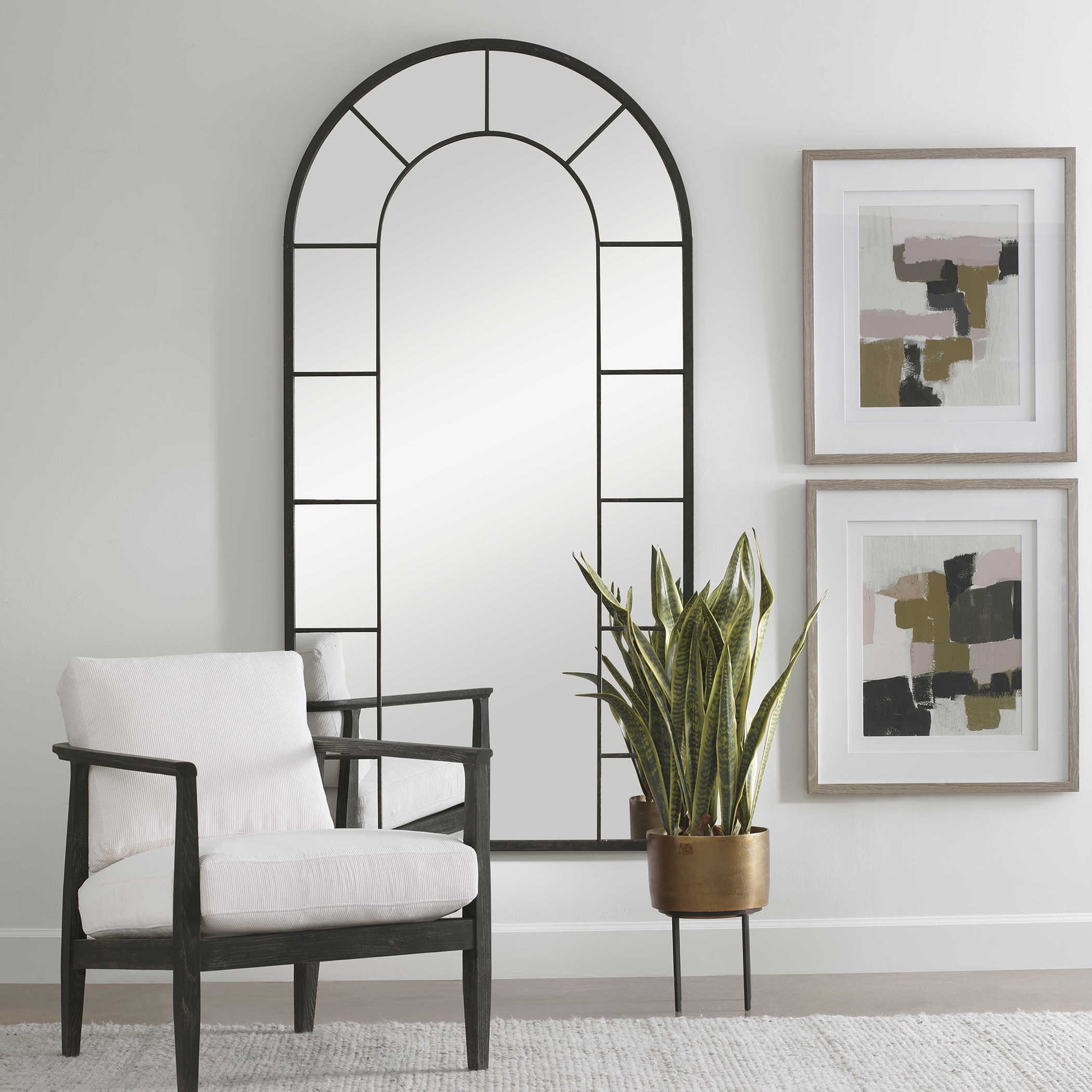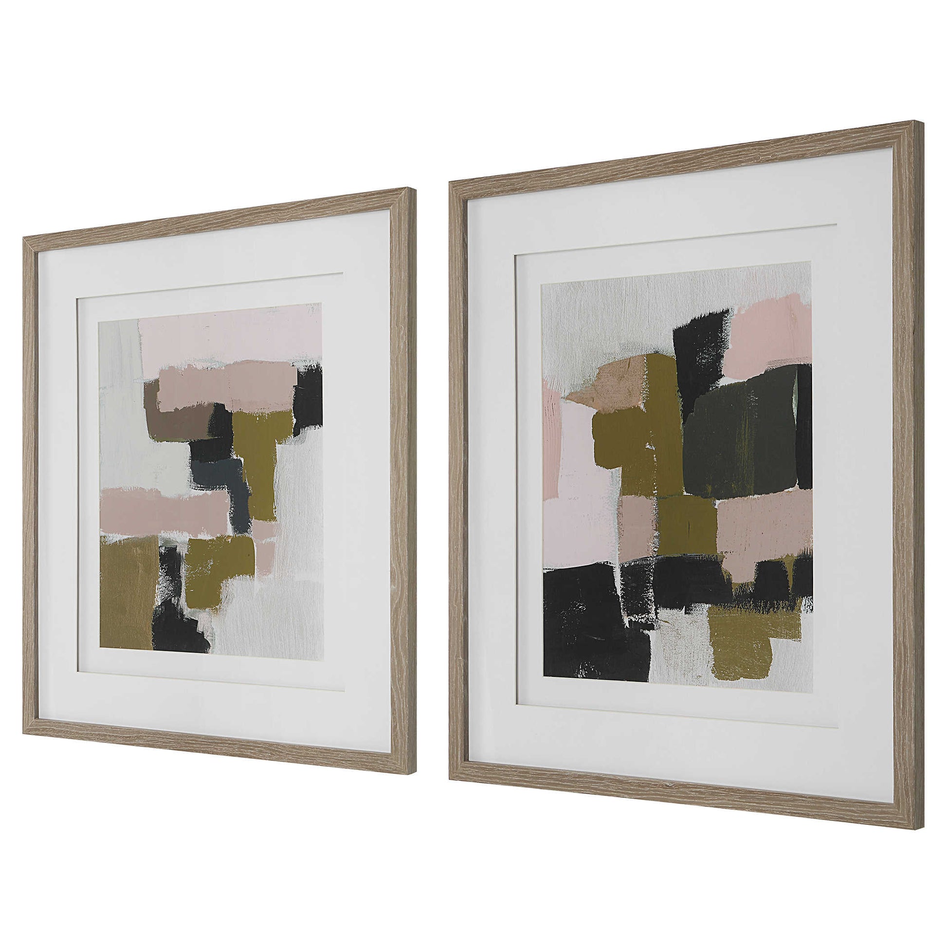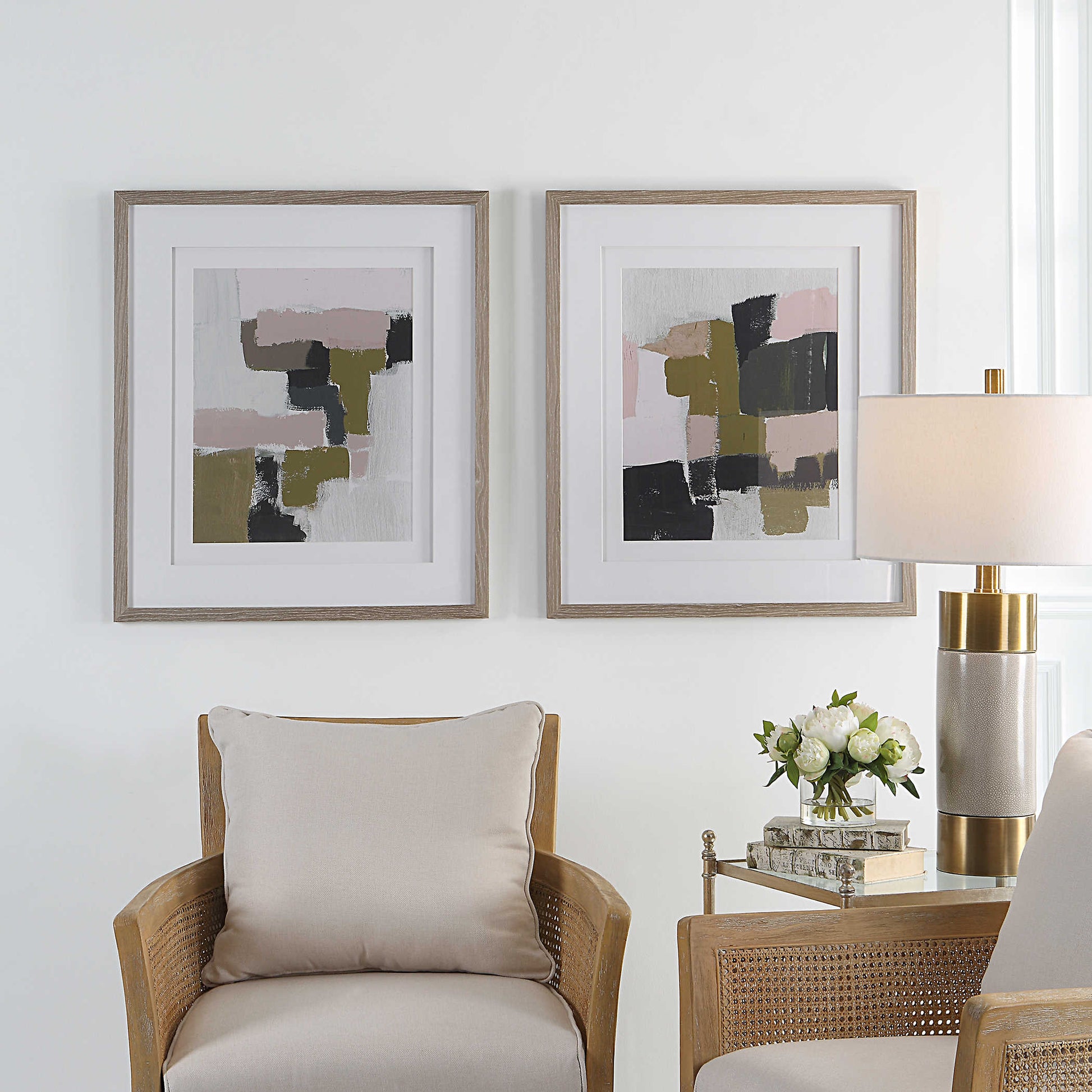 This set of framed prints showcases abstract compositions in cool olive, mauve, rose, and gray tones. Each piece of art is placed under glass and surrounded by double white matting and a solid wood frame in a light oak finish. Artwork by Jennifer Goldberger.