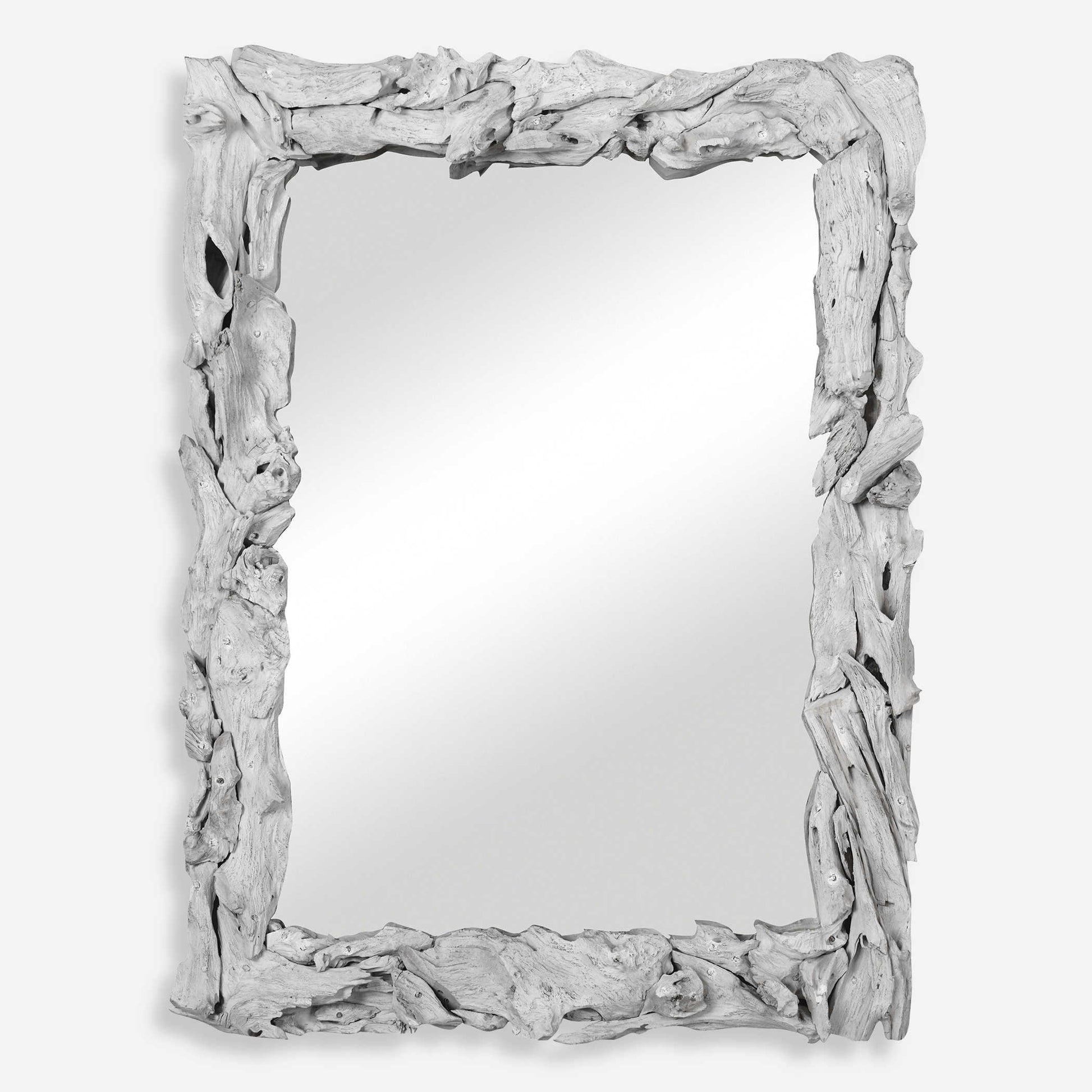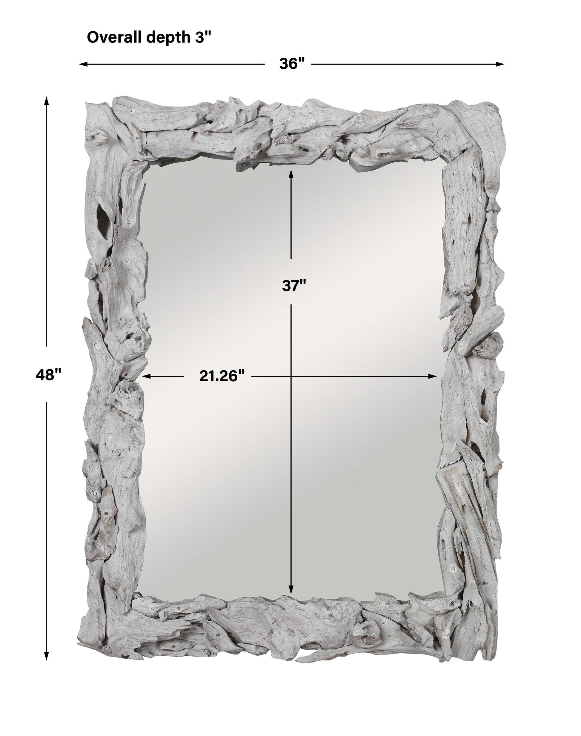 This mirror is handcrafted from natural teak branches with a rustic whitewash finish. Solid wood will continue to move with temperature and humidity changes, which can result in small cracks and uneven surfaces, adding to its authenticity and character. May be hung horizontal or vertical.